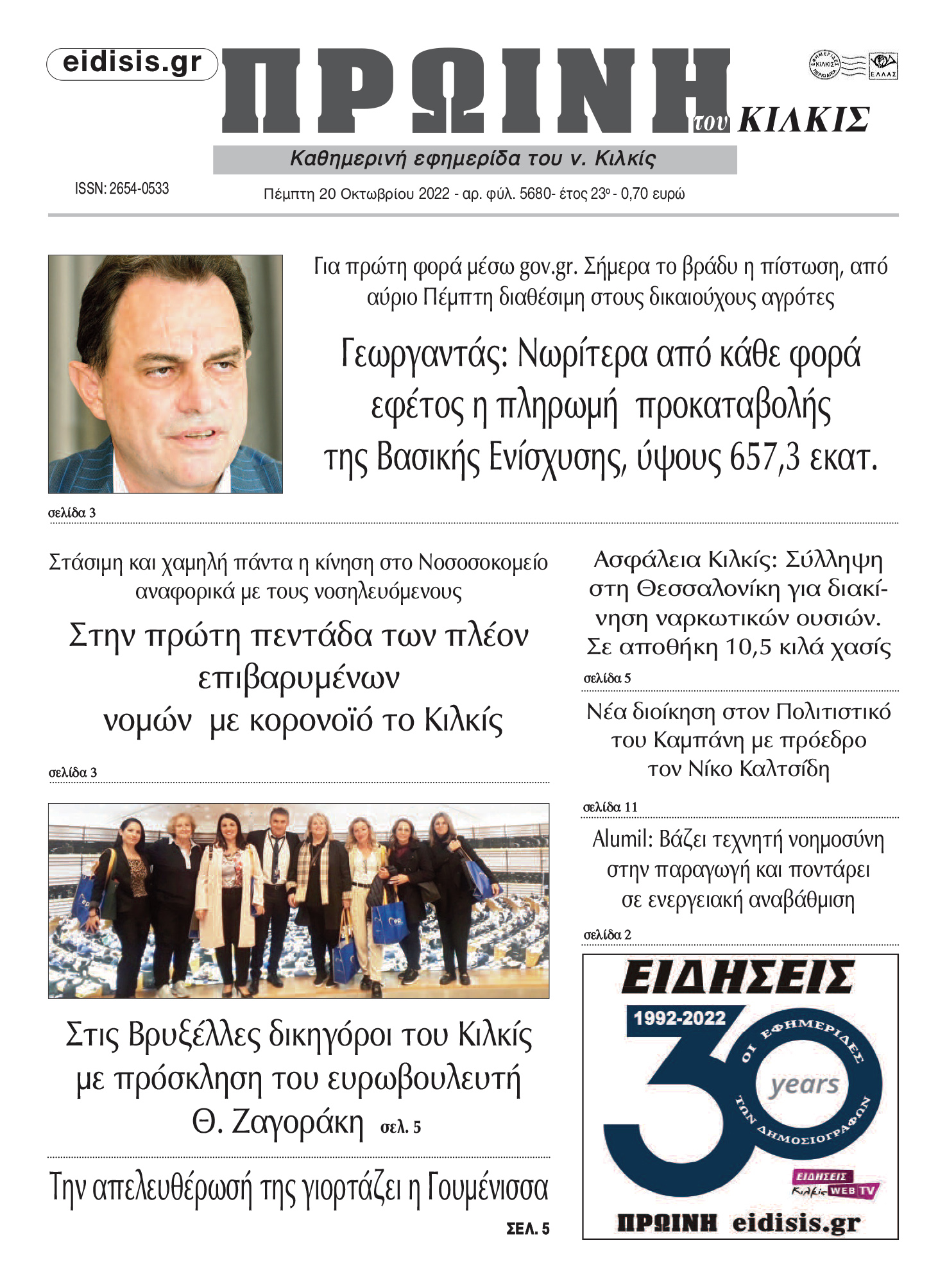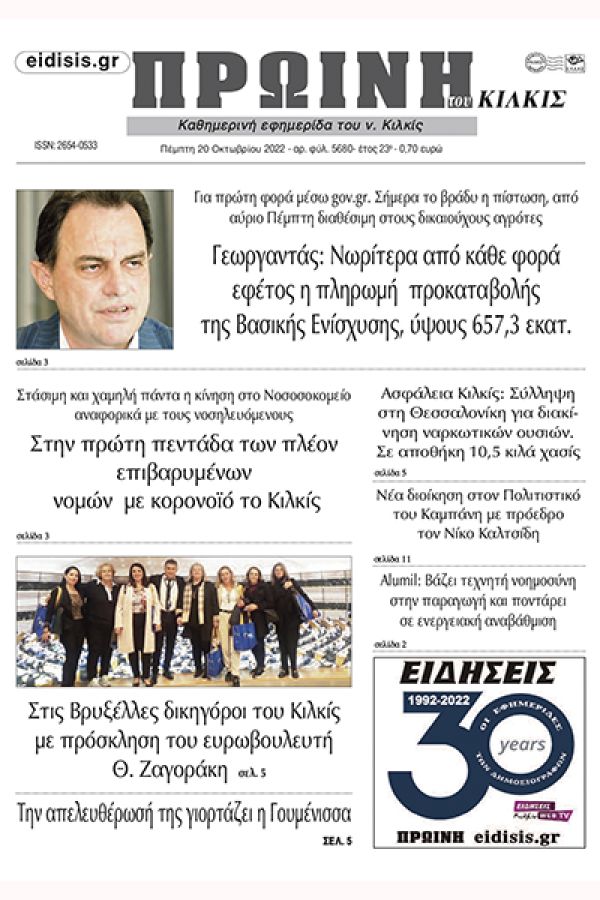 Διαβάστε το νέο πρωτοσέλιδο της Πρωινής του Κιλκίς, μοναδικής καθημερινής εφημερίδας του ν. Κιλκίς (20-10-2022)