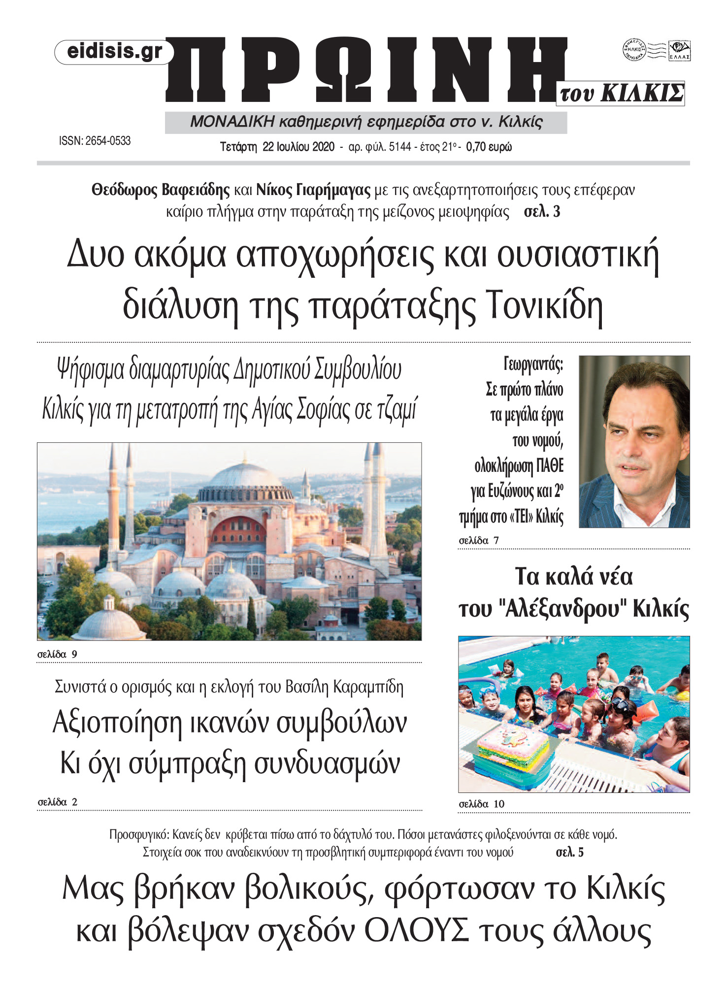 Διαβάστε το νέο πρωτοσέλιδο της Πρωινής του Κιλκίς, μοναδικής καθημερινής εφημερίδας του ν. Κιλκίς (22-7-2020)