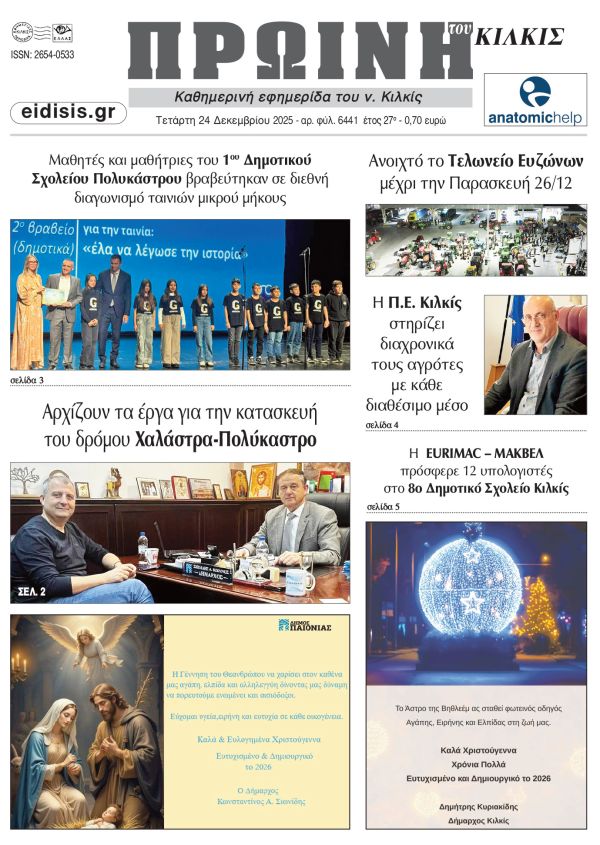 Διαβάστε το νέο πρωτοσέλιδο της Πρωινής του Κιλκίς, μοναδικής καθημερινής εφημερίδας του ν. Κιλκίς (24-12-2025)