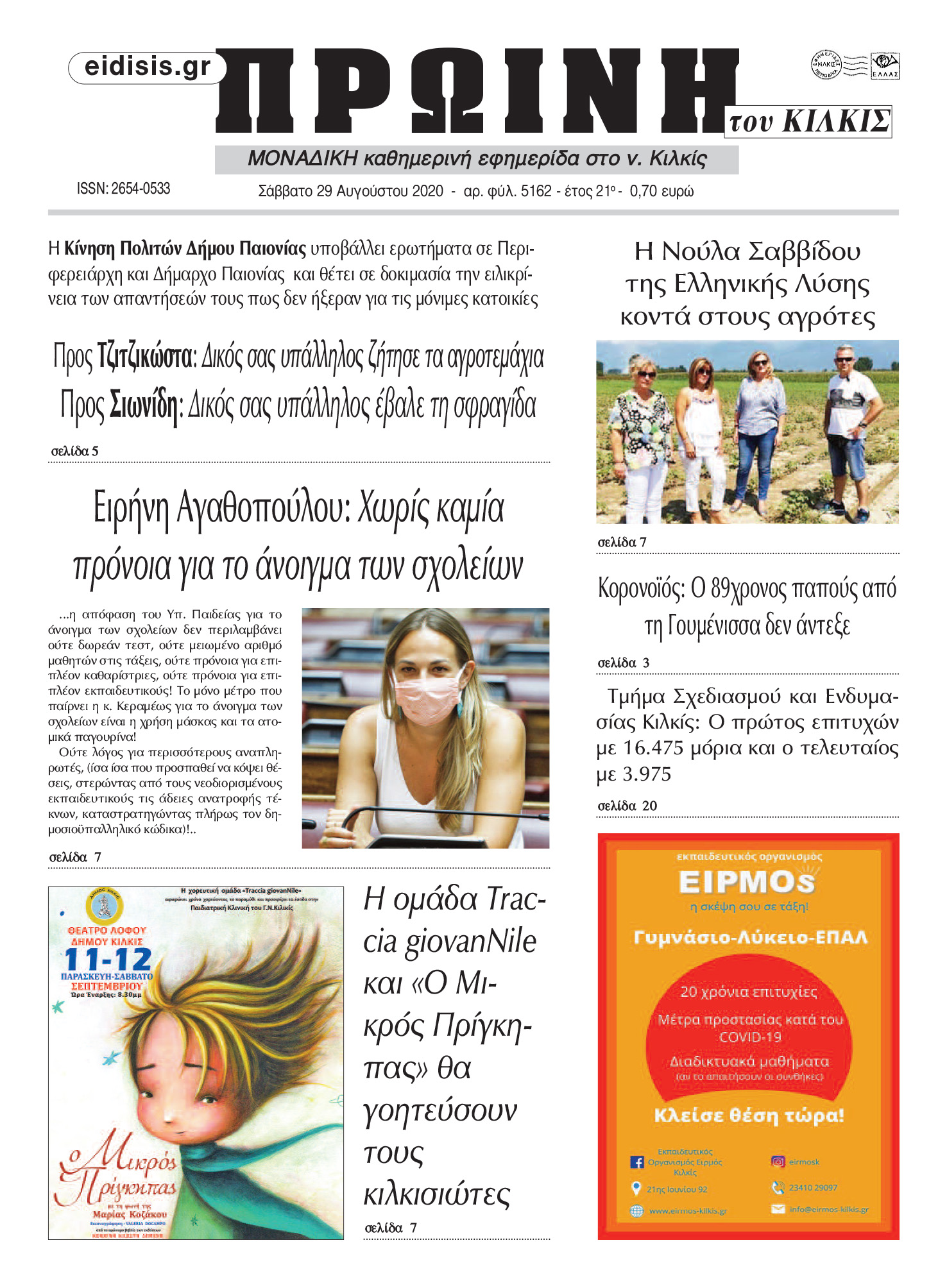 Διαβάστε το νέο πρωτοσέλιδο της Πρωινής του Κιλκίς, μοναδικής καθημερινής εφημερίδας του ν. Κιλκίς (29-8-2020)
