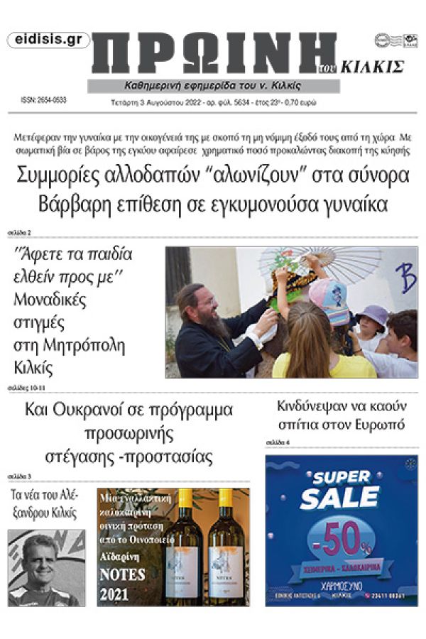 Διαβάστε το νέο πρωτοσέλιδο της Πρωινής του Κιλκίς, μοναδικής καθημερινής εφημερίδας του ν. Κιλκίς (3-8-2022)