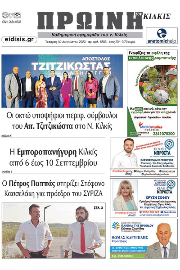 Διαβάστε το νέο πρωτοσέλιδο της Πρωινής του Κιλκίς, μοναδικής καθημερινής εφημερίδας του ν. Κιλκίς (30-8-2023)