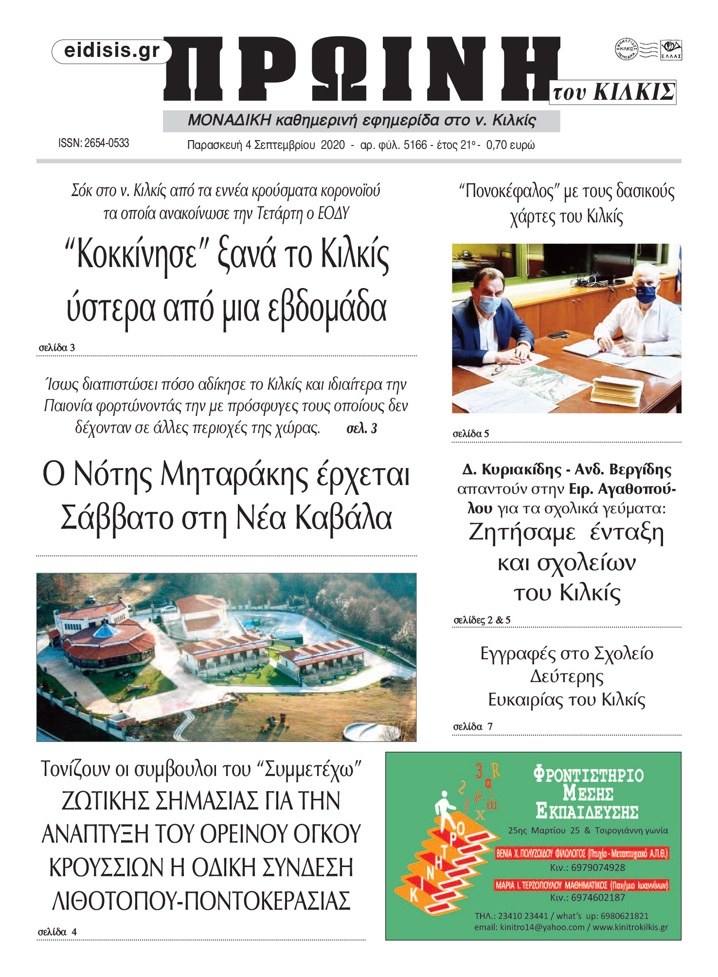 Διαβάστε το νέο πρωτοσέλιδο της Πρωινής του Κιλκίς, μοναδικής καθημερινής εφημερίδας του ν. Κιλκίς (4-9-2020)