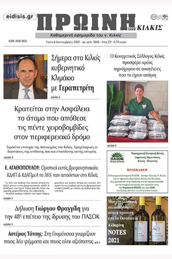 Διαβάστε το νέο πρωτοσέλιδο της Πρωινής του Κιλκίς, μοναδικής καθημερινής εφημερίδας του ν. Κιλκίς (6-9-2022)
