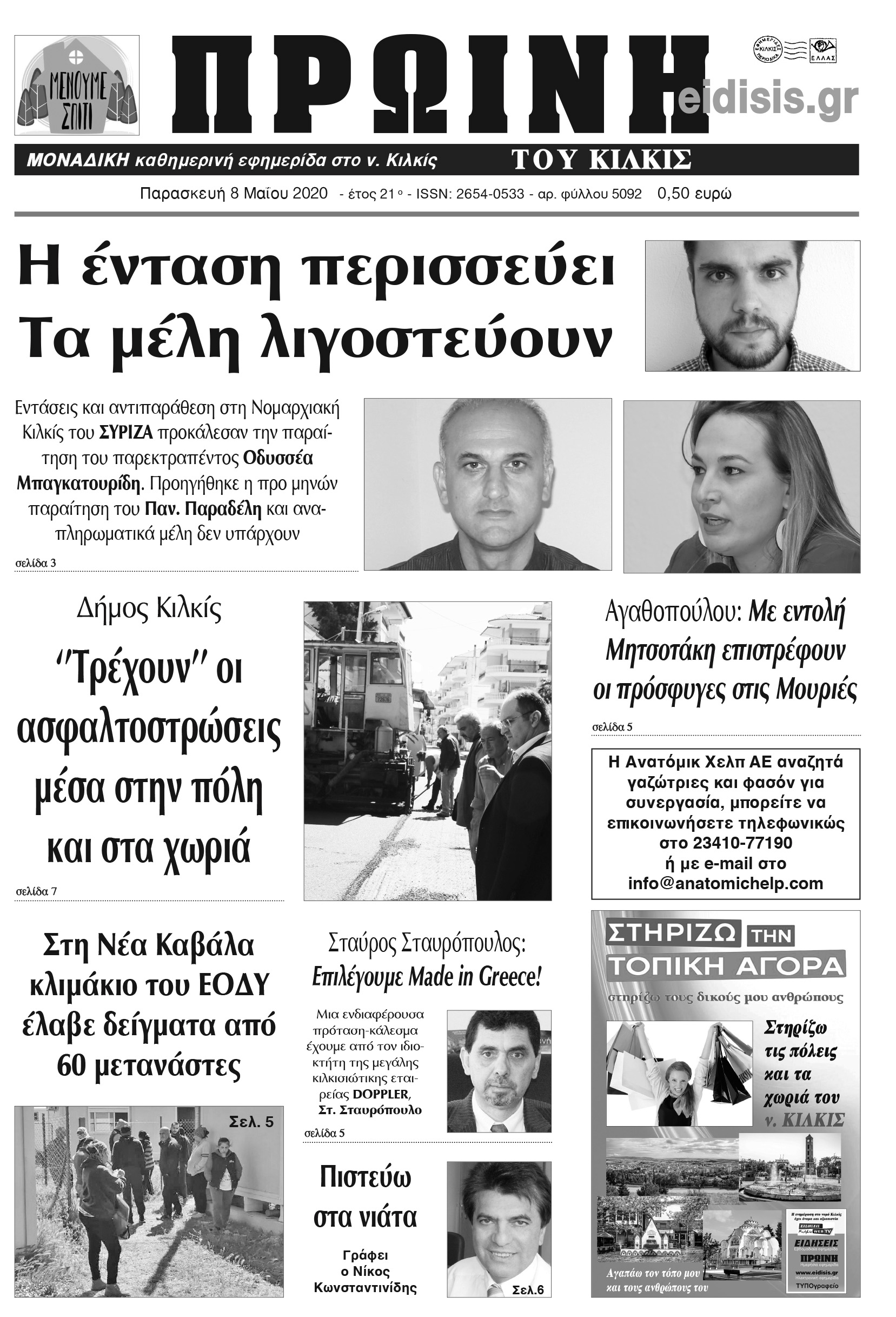 Διαβάστε το νέο πρωτοσέλιδο της Πρωινής του Κιλκίς, μοναδικής καθημερινής εφημερίδας του ν. Κιλκίς (8-5-2020)