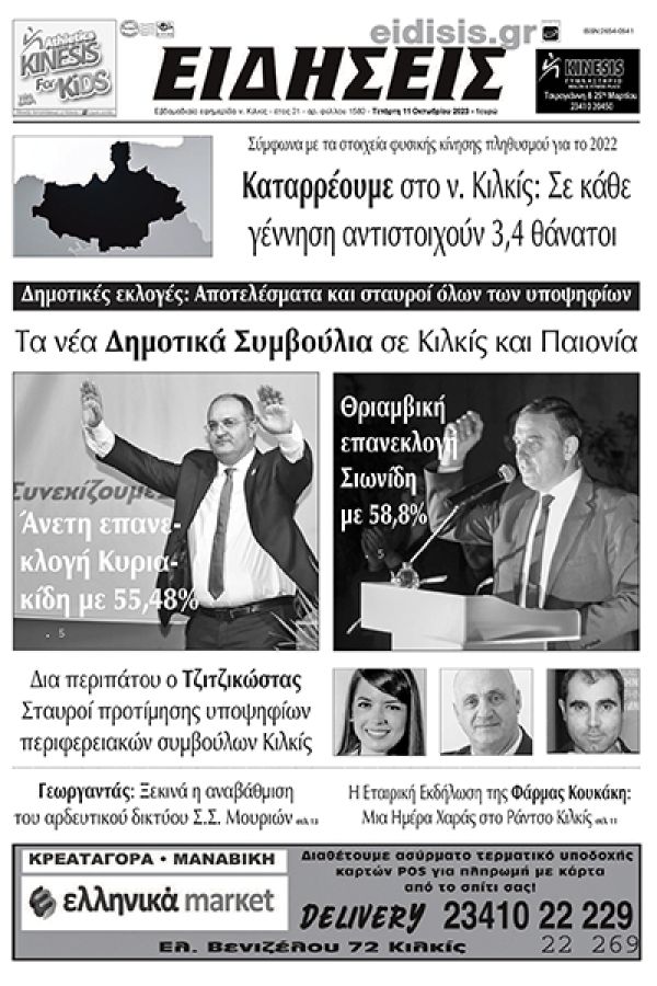 Διαβάστε το νέο πρωτοσέλιδο των ΕΙΔΗΣΕΩΝ του Κιλκίς, της εβδομαδιαίας εφημερίδας του ν. Κιλκίς (11-10-2023)