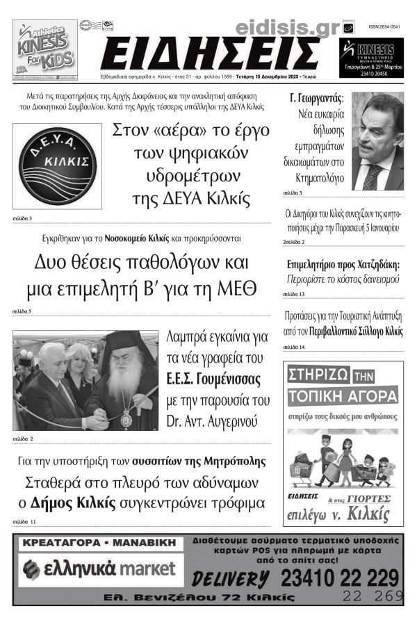Διαβάστε το νέο πρωτοσέλιδο των ΕΙΔΗΣΕΩΝ του Κιλκίς, της εβδομαδιαίας εφημερίδας του ν. Κιλκίς (13-12-2023)