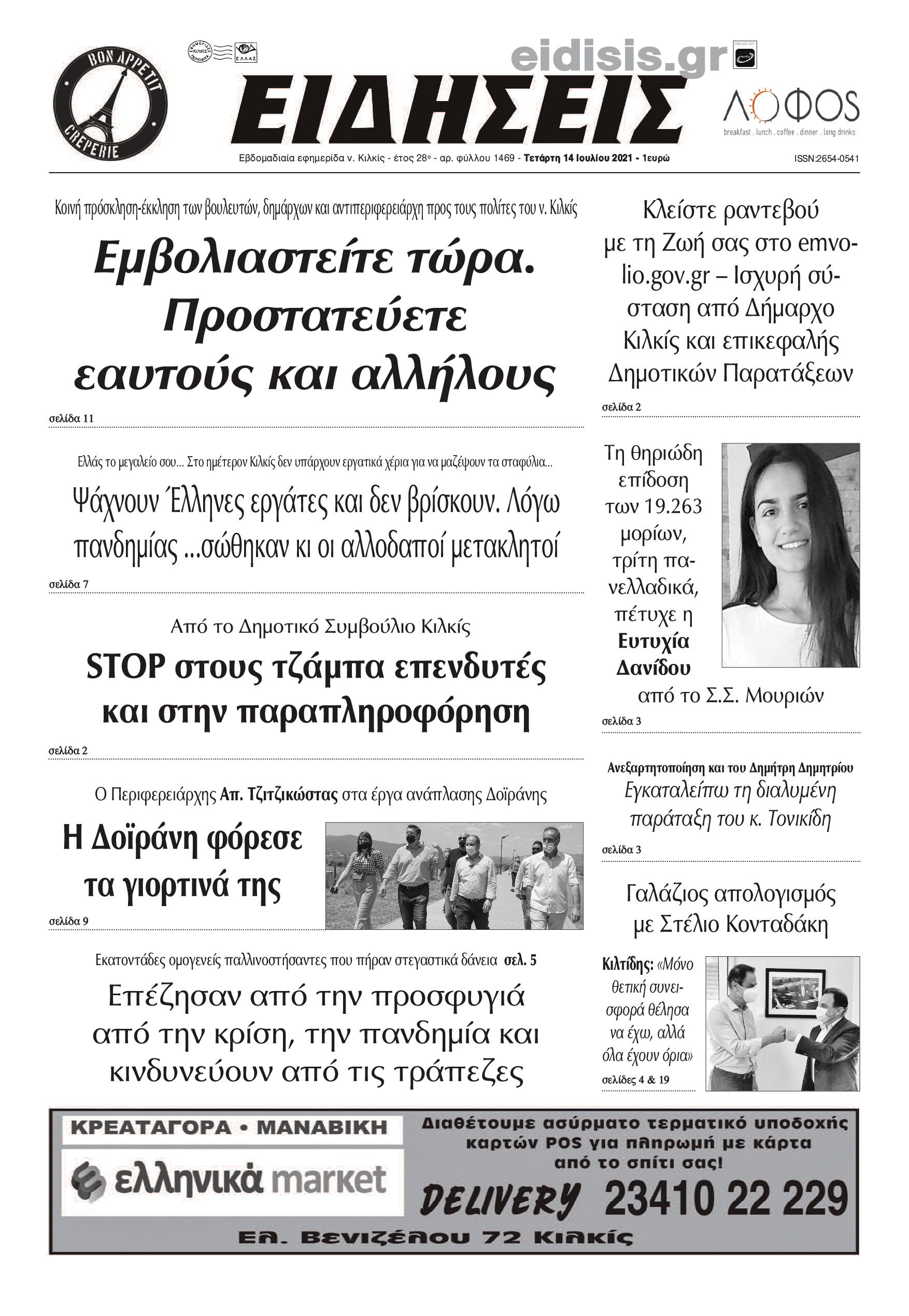 Διαβάστε το νέο πρωτοσέλιδο των ΕΙΔΗΣΕΩΝ του Κιλκίς, της εβδομαδιαίας εφημερίδας του ν. Κιλκίς (14-7-2021)