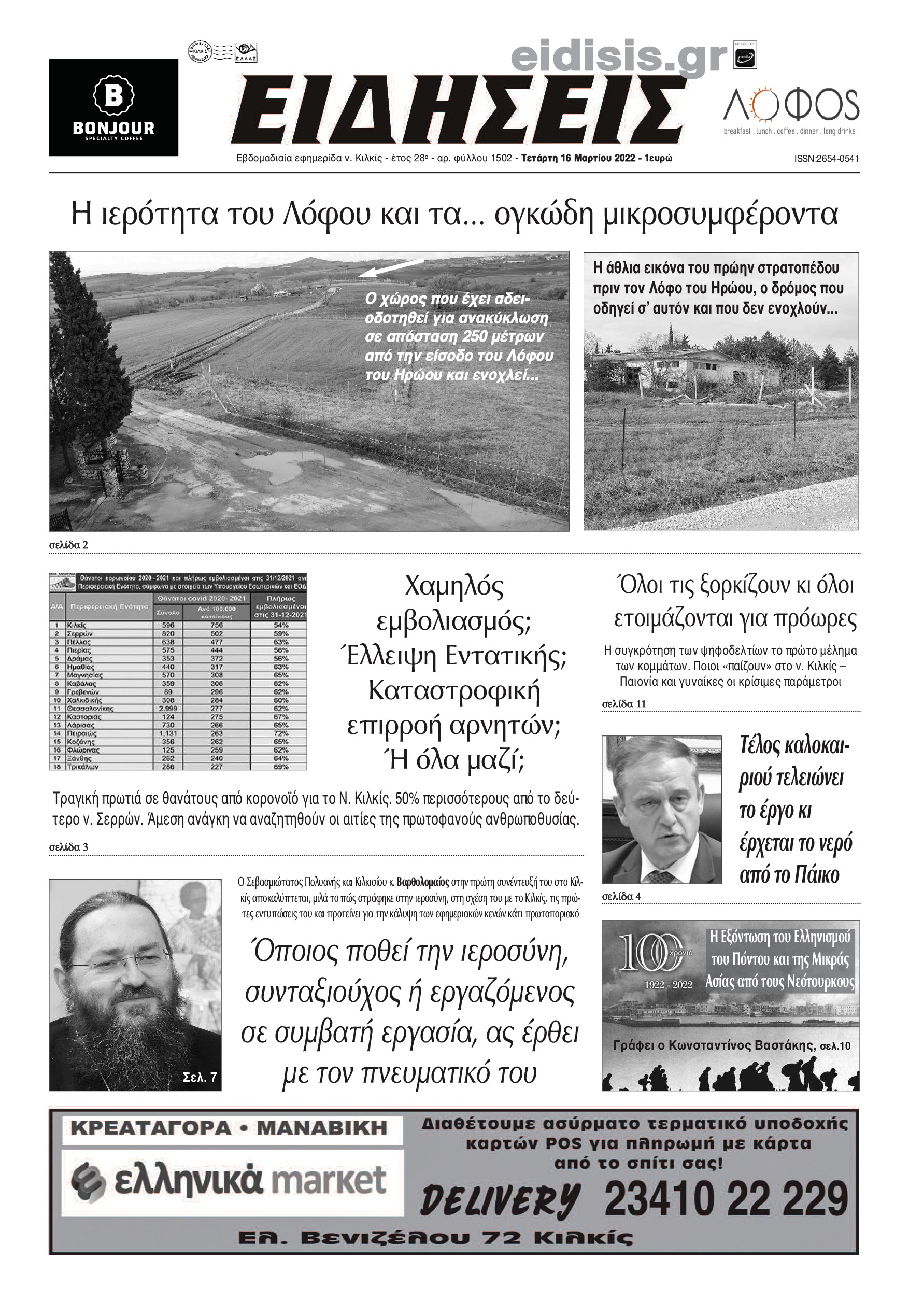Διαβάστε το νέο πρωτοσέλιδο των ΕΙΔΗΣΕΩΝ του Κιλκίς, της εβδομαδιαίας εφημερίδας του ν. Κιλκίς (16-3-2022)