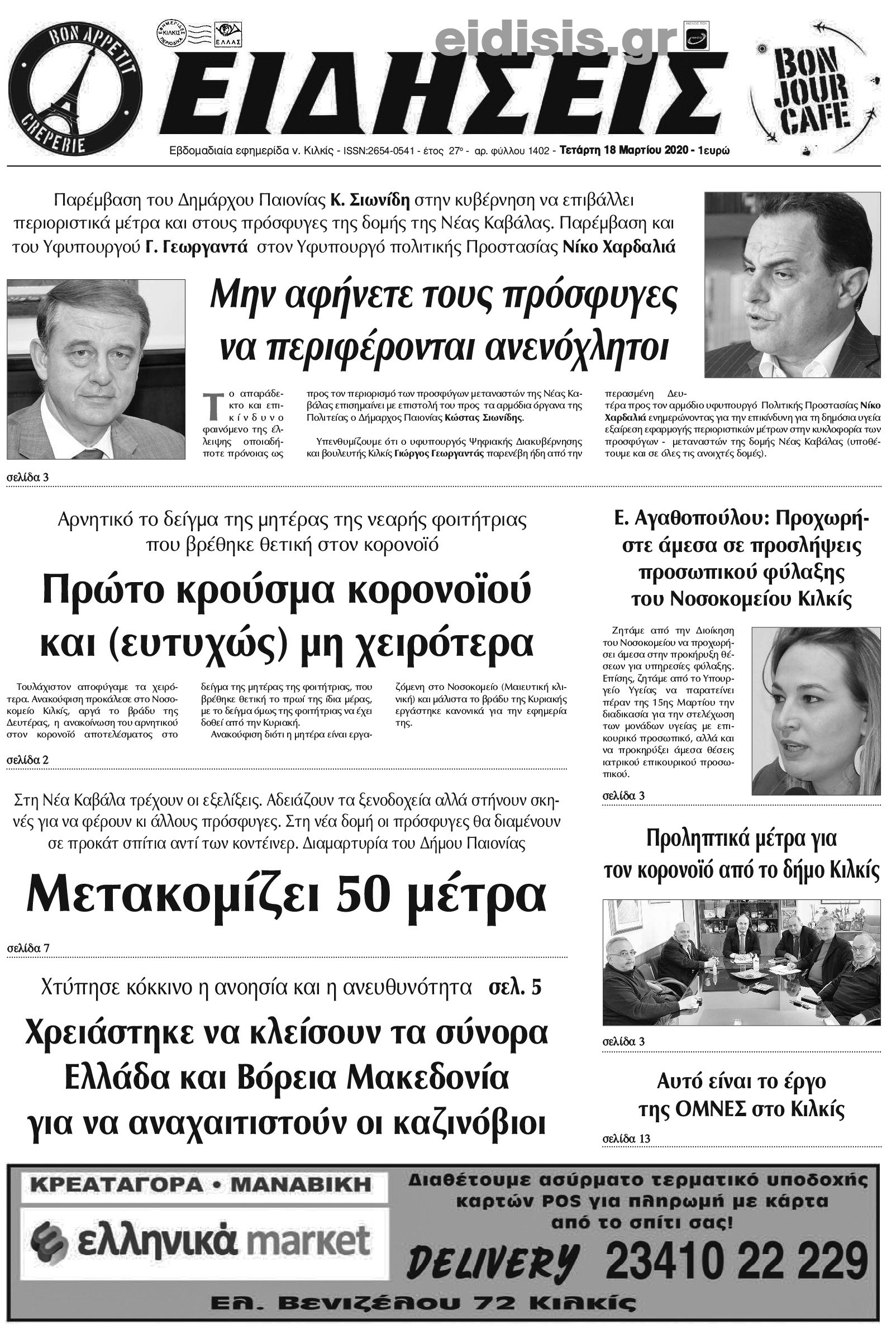Διαβάστε το νέο πρωτοσέλιδο των ΕΙΔΗΣΕΩΝ του Κιλκίς, της εβδομαδιαίας εφημερίδας του ν. Κιλκίς (18-3-2020)
