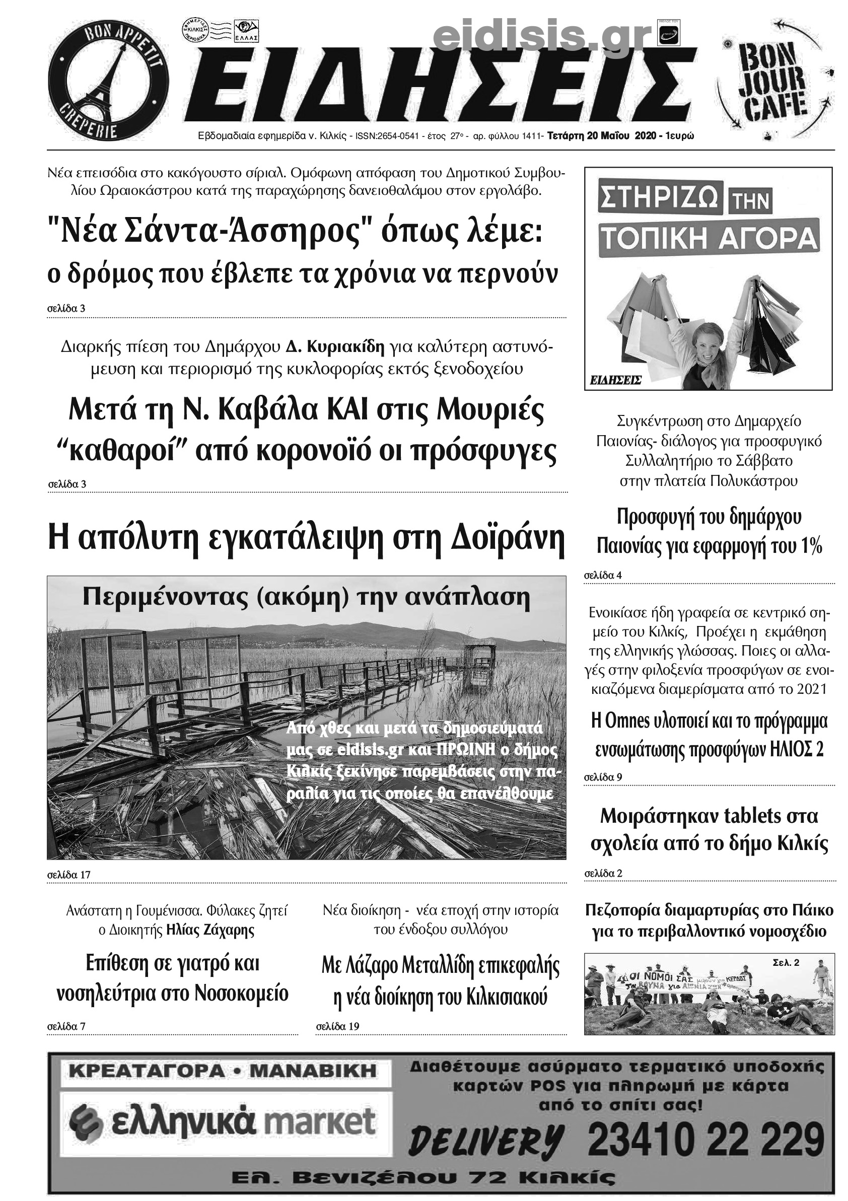 Διαβάστε το νέο πρωτοσέλιδο των ΕΙΔΗΣΕΩΝ του Κιλκίς, της εβδομαδιαίας εφημερίδας του ν. Κιλκίς (20-5-2020)