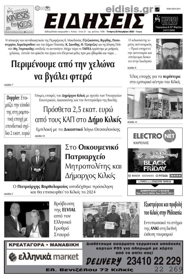 Διαβάστε το νέο πρωτοσέλιδο των ΕΙΔΗΣΕΩΝ του Κιλκίς, της εβδομαδιαίας εφημερίδας του ν. Κιλκίς (22-11-2023)