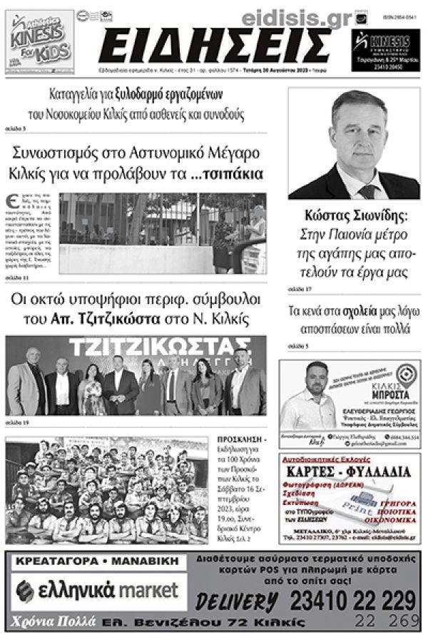 Διαβάστε το νέο πρωτοσέλιδο των ΕΙΔΗΣΕΩΝ του Κιλκίς, της εβδομαδιαίας εφημερίδας του ν. Κιλκίς (30-8-2023)