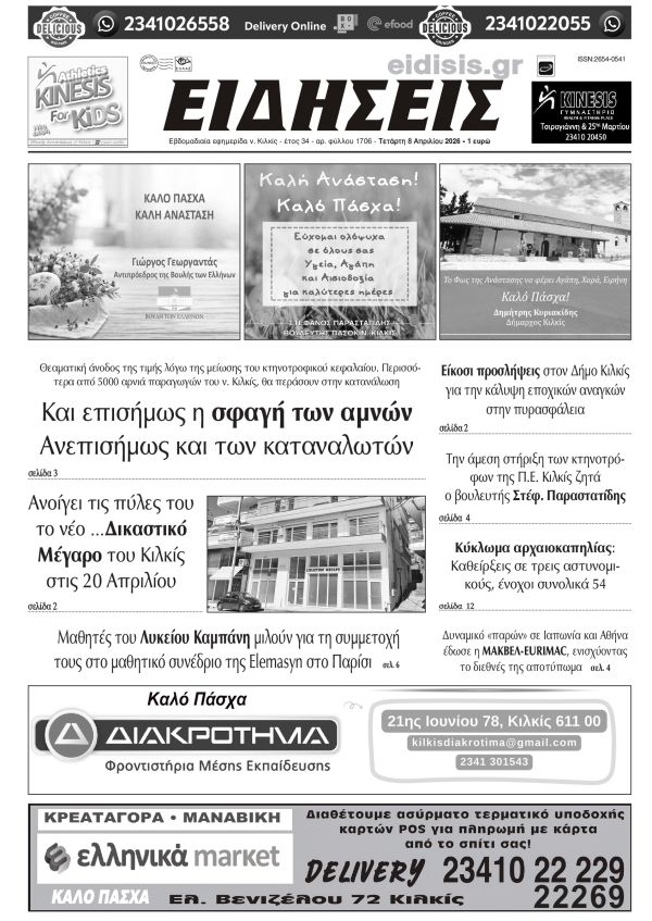 Διαβάστε το νέο πρωτοσέλιδο των ΕΙΔΗΣΕΩΝ του Κιλκίς, της εβδομαδιαίας εφημερίδας του ν. Κιλκίς (8-4-2026)