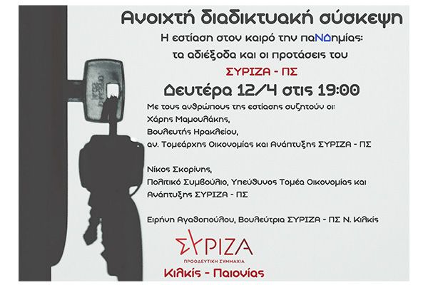 Η εκδήλωση θα γίνει την Δευτέρα 12 Απριλίου στις 7 το απόγευμα. Με τους επαγγελματίες από τον χώρο της εστίασης στο νομό Κιλκίς θα συζητήσουν οι, Νίκος Σκορίνης, Πολιτικό Συμβούλιο, υπεύθυνος Τομέα Οικονομίας και Ανάπτυξης ΣΥΡΙΖΑ -ΠΣ, Χάρης Μαμουλάκης, Βουλευτής Ηρακλείου, αναπληρωτής Τομεάρχης Οικονομίας και Ανάπτυξης ΣΥΡΙΖΑ – ΠΣ και Ειρήνη Αγαθοπούλου Βουλεύτρια ΣΥΡΙΖΑ – ΠΣ ν. Κιλκίς.