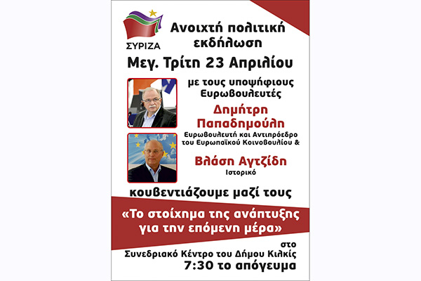 Την Μεγάλη Τρίτη 23 Απριλίου θα επισκεφτούν το νομό Κιλκίς ο Δημήτρης Παπαδημούλης Ευρωβουλευτής και Αντιπρόεδρος του Ευρωπαϊκού Κοινοβουλίου μαζί με τον υποψήφιο Ευρωβουλευτή Βλάση Αγτζίδη