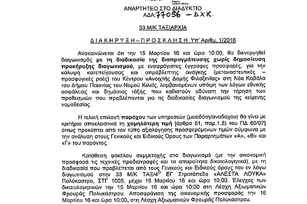 Το Υπουργείο Άμυνας λοιπόν επέλεξε για την ανάδειξη των προμηθευτών σίτισης να προκηρύξει διαγωνισμό χωρίς δημοσίευση, επικαλούμενο λόγους εθνικής ασφάλειας και δημόσιας τάξης, με μόνη την ανάρτησή του στη «Διαύγεια» την Παρασκευή 11 Μαρτίου και καταληκτικό χρόνο κατάθεσης προσφορών την Τρίτη 15 Μαρτίου! Τούτο σημαίνει ότι λόγω και της αργίας της Καθαράς Δευτέρας οι τοπικές επιχειρήσεις που θα μπορούσαν να συμμετάσχουν είχαν ελάχιστες ώρες για να συγκεντρώσουν τα έγγραφα, τις εγγυητικές κο.κ. Πρακτικά τούτο είναι αδύνατο και αποδείχτηκε αφού καμιά τοπική επιχείρηση δεν κατέθεσε φάκελο, μιας και ζητούσαν και δυο ISO! Και η σίτιση χιλιάδων προσφύγων κατακυρώθηκε σε μια επιχείρηση της Θεσσαλονίκης που προσέφερε έκπτωση 3%! Σύμφωνα με πληροφορίες μας στο διαγωνισμό κατέθεσε φάκελο μια ακόμα επιχείρηση από την Καβάλα.