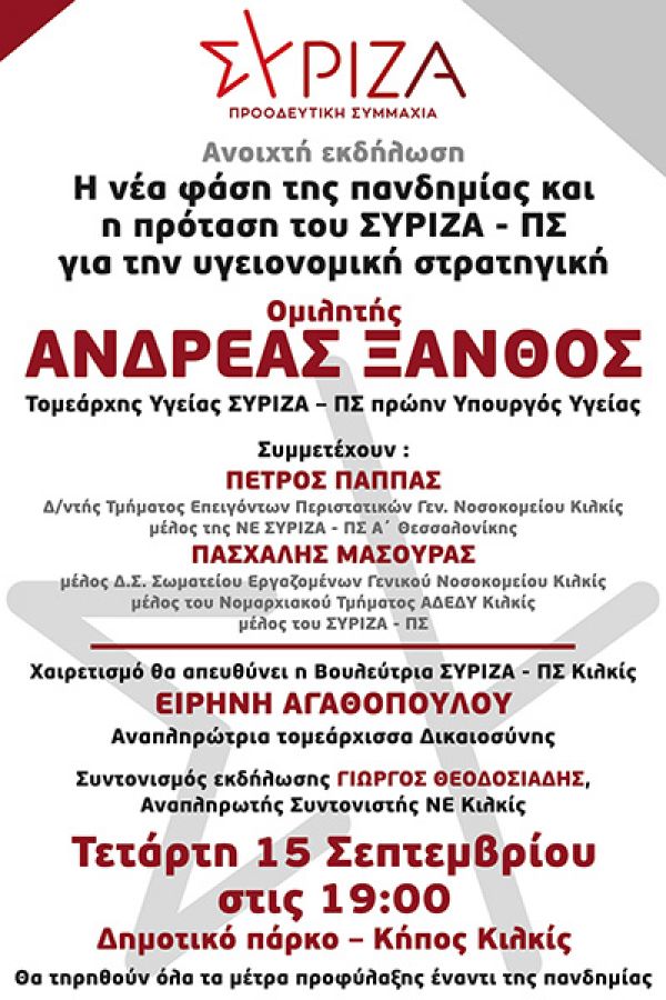 Το απόγευμα στις 7 θα ακολουθήσει ανοιχτή εκδήλωση στο Δημοτικό πάρκο (Κήπος Κιλκίς) με θέμα "H NEA ΦAΣH THΣ ΠANΔHMIAΣ KAI H ΠPOTAΣH TOY ΣYPIZA-ΠΣ ΓIA THN YΓEIONOMIKH ΣTPATHΓIKH" στην οποία θα μιλήσει ο Α. Ξανθός και θα απευθύνει χαιρετισμό η βουλευτρια Κιλκίς και αναπληρώτρια τομεάρχισσα δικαιοσύνης του ΣΥΡΙΖΑ-ΠΣ, Ε. Αγαθοπούλου.