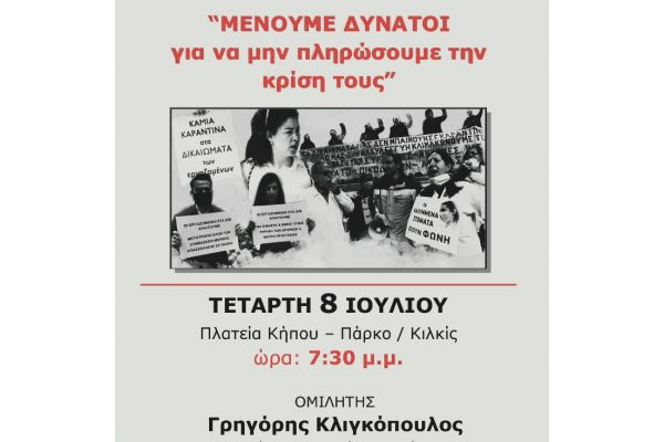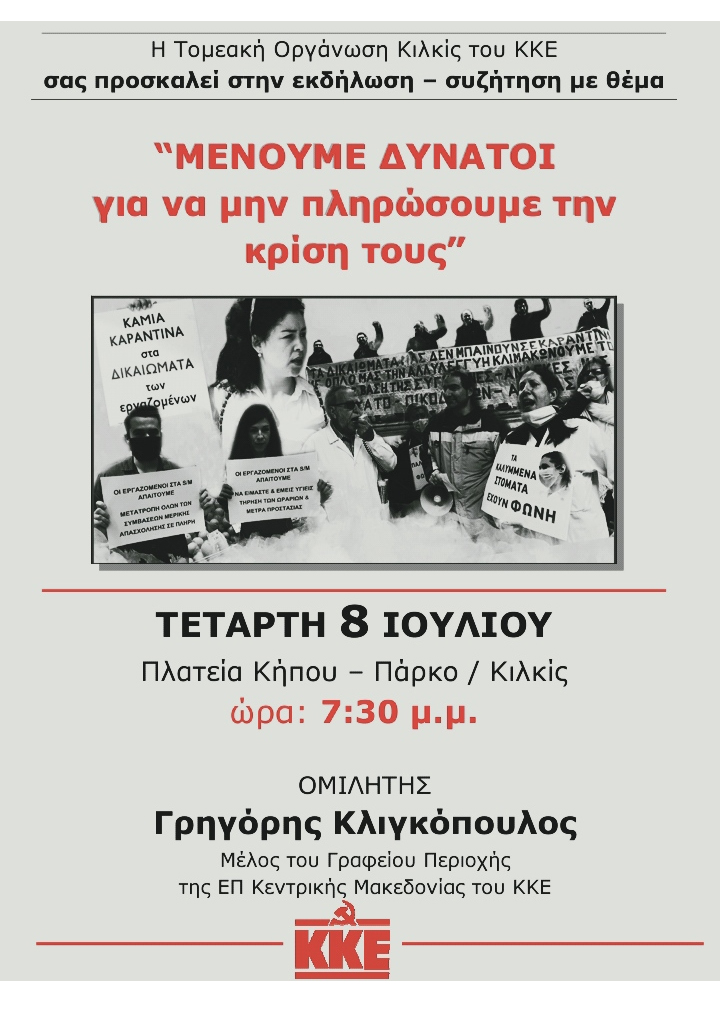Η Τομεακή Επιτροπή Κιλκίς του ΚΚΕ διοργανώνει την Τετάρτη 8 Ιουλίου, στις 7:30 μ.μ., στην Πλατεία Κήπου – Πάρκο, στο Κιλκίς, εκδήλωση – συζήτηση με θέμα: «Μένουμε Δυνατοί, για να μην πληρώσουμε την κρίση τους», με ομιλητή τον Γρηγόρη Κλιγκόπουλο, μέλος του Γραφείου Περιοχής της ΕΠ Κεντρικής Μακεδονίας του ΚΚΕ.