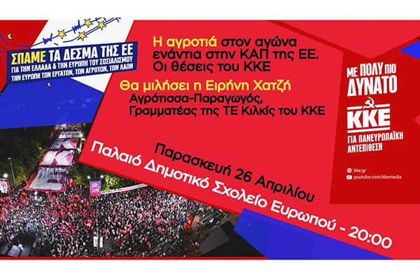 Στο Παλαιό Δημοτικό Σχολείο Ευρωπού, την Παρασκευή 26/4, στις 20:00μμ, θα μιλήσει η Ειρήνη Χατζή, αγρότισσα – παραγωγός και γραμματέας της Τ.Ε. Κιλκίς του ΚΚΕ.