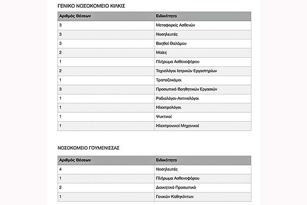 Ενίσχυση με επικουρικό προσωπικό των Νοσοκομείων Κιλκίς και Γουμένισσας