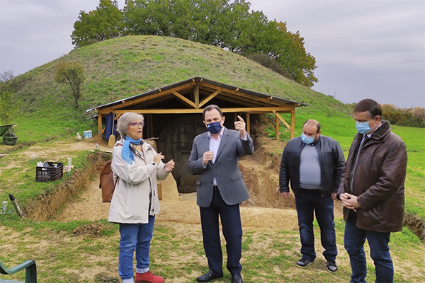 Ο Υφυπουργός ξεναγήθηκε στα μνημεία του αρχαιολογικού χώρου από την Προϊσταμένη της Εφορείας Αρχαιοτήτων Κιλκίς Γεωργία Στρατούλη, ενώ ενημερώθηκε για την εξέλιξη της ανασκαφικής έρευνας και την πορεία των εργασιών προστασίας και ανάδειξης των δύο ταφικών τύμβων και του περιβάλλοντος χώρου τους.