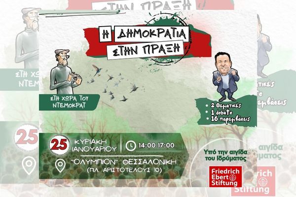 Μετά την επιτυχημένη εκδήλωση στην Αθήνα υπό την αιγίδα του Ιδρύματος Friedrich-Ebert-Stiftung (FES Ελλάδα), με θέμα «Δημοκρατία Vs Αυταρχισμός: η σύγκρουση που θα κρίνει το μέλλον», ο Ντέμοκρατ συνεχίζει τον δημόσιο διάλογο για τις μεγάλες δημοκρατικές προκλήσεις της εποχής μας και μεταφέρει τη συζήτηση στη Θεσσαλονίκη, την Κυριακή 25 Ιανουαρίου στο Ολύμπιον (Πλατεία Αριστοτέλους), από τις 14:00 έως τις 17:00.