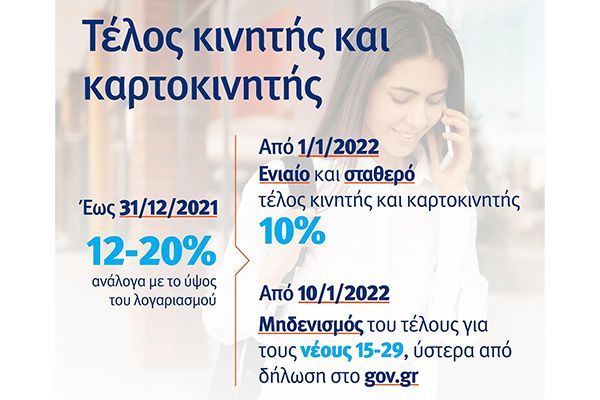 Ειδικά όσον αφορά τους νέους ηλικίας 15-29 ετών, ισχύει η πλήρης κατάργηση των τελών κινητής και καρτοκινητής τηλεφωνίας. Μάλιστα, από τις 10 Ιανουαρίου θα είναι διαθέσιμη μέσω του gov.gr η πλατφόρμα στην οποία οι νέοι της ως άνω ηλικιακής ομάδας θα μπορούν να δηλώνουν τον αριθμό του κινητού τους και να απαλλάσσονται πλήρως από τα τέλη κινητής και καρτοκινητής τηλεφωνίας.