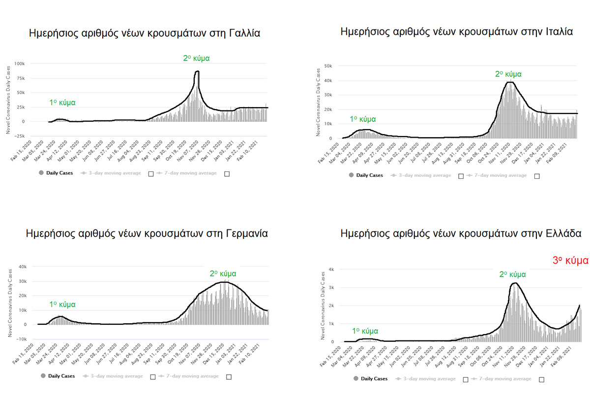 ''Χρησιμοποιώντας τα στατιστικά του worldometers επιχείρησα να κάνω μία συνοπτική σύγκριση γραφημάτων της Ελλάδας με άλλα Ευρωπαϊκά κράτη όσον αφορά την αντιμετώπιση της πανδημίας του νέου κορονοϊού. Αυτό που προκύπτει είναι ότι χώρες όπως η Γαλλία, η Γερμανία και η Ιταλία έχουν αποφύγει μέχρι σήμερα το τρίτο επιδημιολογικό κύμα, προφανώς βελτιώνοντας τη στρατηγική τους στη βάση της εμπειρίας των δύο πρώτων κυμάτων.