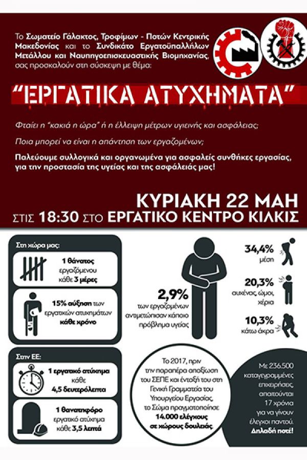 Το Σωματείο Τροφίμων Ποτών Κεντρικής Μακεδονίας και το Συνδικάτο Μετάλλου και Ναυπηγοεπισκευαστικής Βιομηχανίας Κεντρικής Μακεδονίας καλούν τους εργαζόμενους του Νομού Κιλκίς στην εκδήλωση με θέμα «Εργατικά Ατυχήματα-Η διεκδίκηση μέτρων προστασίας να γίνει υπόθεση των ίδιων των εργαζόμενων».