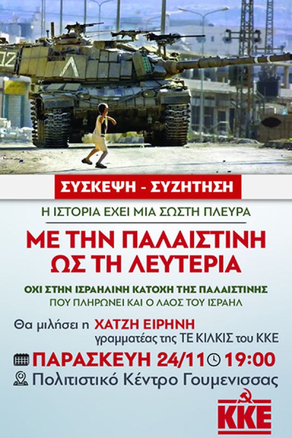Η ΤΟ Κιλκίς του ΚΚΕ διοργανώνει σύσκεψη – συζήτηση για τις εξελίξεις στην Παλαιστίνη με ομιλήτρια, την Ειρήνη Χατζή, γραμματέα της Τομεακής Επιτροπής Κιλκίς του ΚΚΕ, την Παρασκευή 24/11/2023 στο Πολιτιστικό κέντρο Γουμένισσας στις 19:00.
