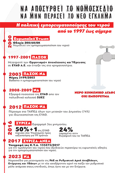 Η σημερινή εξέλιξη είναι συνέχεια του νομικού πλαισίου που έχει διαμορφωθεί μέχρι τώρα, της πολιτικής ξεπουλήματος του νερού και της ένταξης της ΕΥΔΑΠ και της ΕΥΑΘ στο Υπερταμείο των ιδιωτικοποιήσεων.