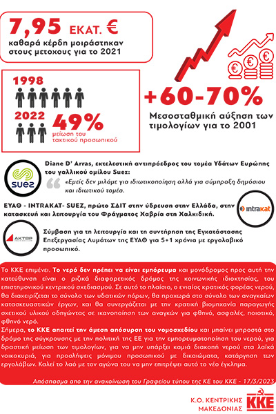 Το νερό είναι κοινωνικό αγαθό και είναι αδιανόητο να εντάσσεται στη λογική της κερδοφορίας. Για αυτό χρειάζεται να δυναμώσει ο αγώνας ενάντια στην πολιτική της ΕΕ για την πλήρη εμπορευματοποίηση του νερού και τις ιδιωτικοποιήσεις. Νερό, μονάδες επεξεργασίας, δίκτυα και άρδευση δεν μπορεί να είναι εμπορεύματα. Η διαχείριση του νερού προς όφελος του λαού προϋποθέτει απαλλαγή από τους νόμους της αγοράς και του κέρδους.