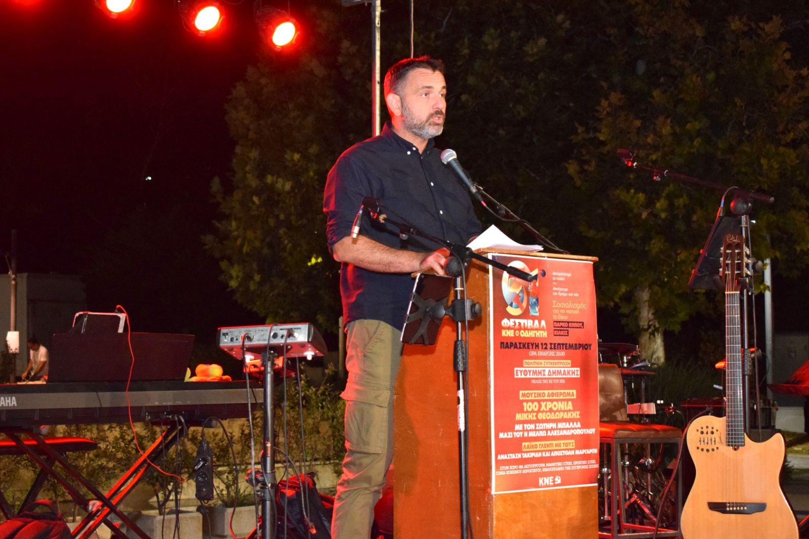 Στιγμές αγωνιστικής ανάτασης προσέφερε το άρτια επιμελημένο και αξέχαστο αφιέρωμα στα 100 χρόνια από τη γέννηση του Μίκη Θεοδωράκη από τον Σωτήρη Μπαλλά και το συγκρότημά του, που μαζί με την Μέλπω Αλεξανδροπούλου και τις εξαιρετικές ερνηνείες τους συγκίνησαν και ξεσήκωσαν το κοινό. Ακούστηκαν κομμάτια του έργου του μεγάλου δημιουργού που έχουν σφραγίσει διαχρονικά τους αγώνες του λαού. Το μουσικό πρόγραμμα συνεχίστηκε με τους επίσης υπέροχους Αναστάση Τσακιρίδη και Αποστόλη Μαργαρίτη με καλό λαικό και παραδοσιάκο τραγούδι.