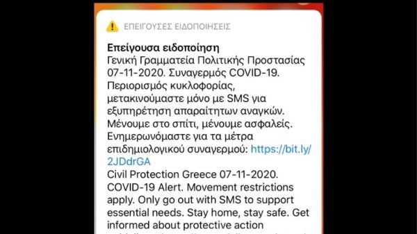 «Συναγερμός Covid-19. Περιορισμός κυκλοφορίας, μετακινούμαστε μόνο με SMS για εξυπηρέτηση απαραίτητων αναγκών. Μένουμε σπίτι, μένουμε ασφαλείς» αναφέρει μεταξύ άλλων το μήνυμα, που παραπέμπει τους πολίτες στην ιστοσελίδα που μπορούν να ενημερωθούν για τα μέτρα που ισχύουν στο δεύτερο απαγορευτικό.