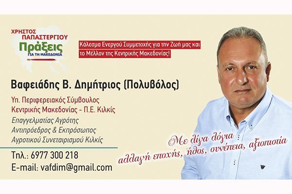 Ο ΔΗΜΗΤΡΗΣ Β. ΒΑΦΕΙΑΔΗΣ (Πολυβόλος) υποψήφιος Περιφερειακός σύμβουλος Κιλκίς με το «Πράξεις για τη Μακεδονία» και τον Χρήστο ΠΑΠΑΣΤΕΡΓΙΟΥ
