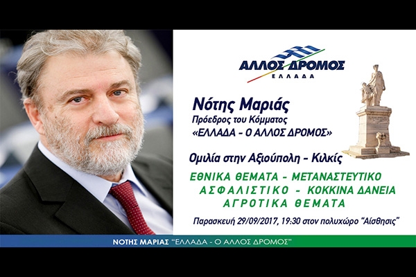 Ο ευρωβουλευτής και πρόεδρος του κόμματος "Ελλάδα ο Άλλος Δρόμος" καθηγητής Νότης Μαριάς θα μιλήσει την Παρασκευή 29 Σεπτεμβρίου 2017, στις 19:30 στον πολυχώρο "Αίσθησις", οδός Ξενοπούλου Γρηγορίου, Αξιούπολη - Κιλκίς, για τα εθνικά θέματα, το μεταναστευτικό,το ασφαλιστικό, τα αγροτικά θέματα και τα κόκκινα δάνεια.