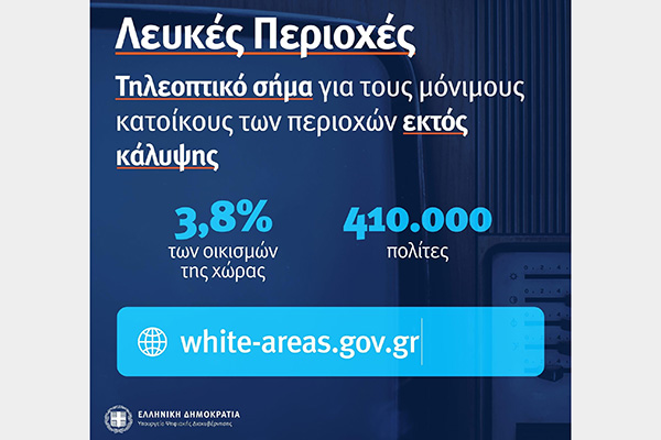 Με τη δράση «Λευκές περιοχές», 160.869 νοικοκυριά σε 4.079 οικισμούς που βρίσκονταν εκτός τηλεοπτικής κάλυψης αποκτούν πρόσβαση σε αυτή δωρεάν και για διάστημα οκτώ ετών, με μια ιδιαίτερα απλή διαδικασία.