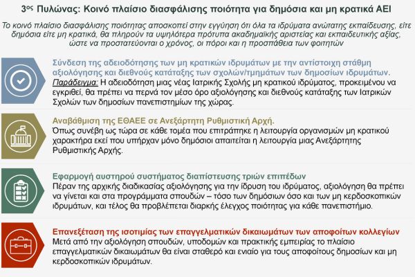 - Στον τρίτο πυλώνα της πολιτικής μας, επικεντρωνόμαστε στη διαμόρφωση ενός κοινού πλαισίου διασφάλισης ποιότητας, το οποίο αποσκοπεί στην εγγύηση ότι όλα τα ιδρύματα ανώτατης εκπαίδευσης, είτε δημόσια είτε μη κερδοσκοπικά, θα πληρούν τα υψηλότερα πρότυπα ακαδημαϊκής αριστείας και εκπαιδευτικής αξίας. Αναγνωρίζουμε τη σπουδαιότητα της ακαδημαϊκής ποιότητας ως βασικού διακριτικού σημείου στην ανώτερη εκπαίδευση και επιδιώκουμε να εξασφαλίσουμε ότι κάθε προσφερόμενο πρόγραμμα σπουδών θα παρέχει στους φοιτητές τις δεξιότητες και τις γνώσεις που απαιτούνται για να επιτύχουν στον σύγχρονο, παγκοσμιοποιημένο κόσμο. Η διαμόρφωση αυτού του πλαισίου διασφάλισης ποιότητας είναι απαραίτητη για την ενίσχυση της εμπιστοσύνης στην ανώτατη εκπαίδευση και την αναγνώριση των ελληνικών πτυχίων διεθνώς, καθώς και για την ενθάρρυνση της ανταλλαγής γνώσης και της καινοτομίας.