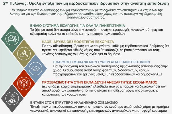 - Ομαλή ένταξη των μη κερδοσκοπικών ιδρυμάτων στην ανώτατη εκπαίδευση, με κοινό σύστημα εισαγωγής, ενίσχυση της αποκέντρωσης και αποφυγή κορεσμού αντικειμένων σπουδών.