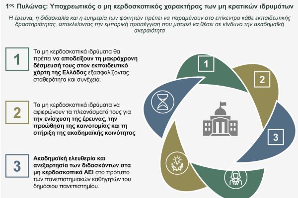 - Ο πρώτος πυλώνας της πολιτικής μας εστιάζεται στον υποχρεωτικά μη κερδοσκοπικό χαρακτήρα για όλα τα μη κρατικά ιδρύματα. Είναι σαφής η επιθυμία μας απομάκρυνσης την έννοιας του εμπορικού κέρδους από την παροχή εκπαίδευσης. Τονίζουμε ότι η έρευνα, η διδασκαλία και η ευημερία των φοιτητών πρέπει να παραμένουν στο επίκεντρο κάθε εκπαιδευτικής δραστηριότητας, αποκλείοντας την εμπορική προσέγγιση που μπορεί να θέσει σε κίνδυνο την ακαδημαϊκή ακεραιότητα.