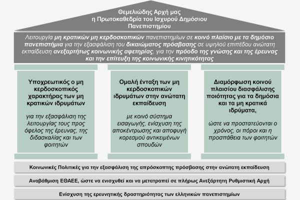 Οι τρεις πυλώνες της θέσης μας για τη λειτουργία μη κρατικών, μη κερδοσκοπικών πανεπιστημίων στην χώρα μας παραμένουν αμετάβλητοι και είναι οι εξής (βλ. σχήμα):
