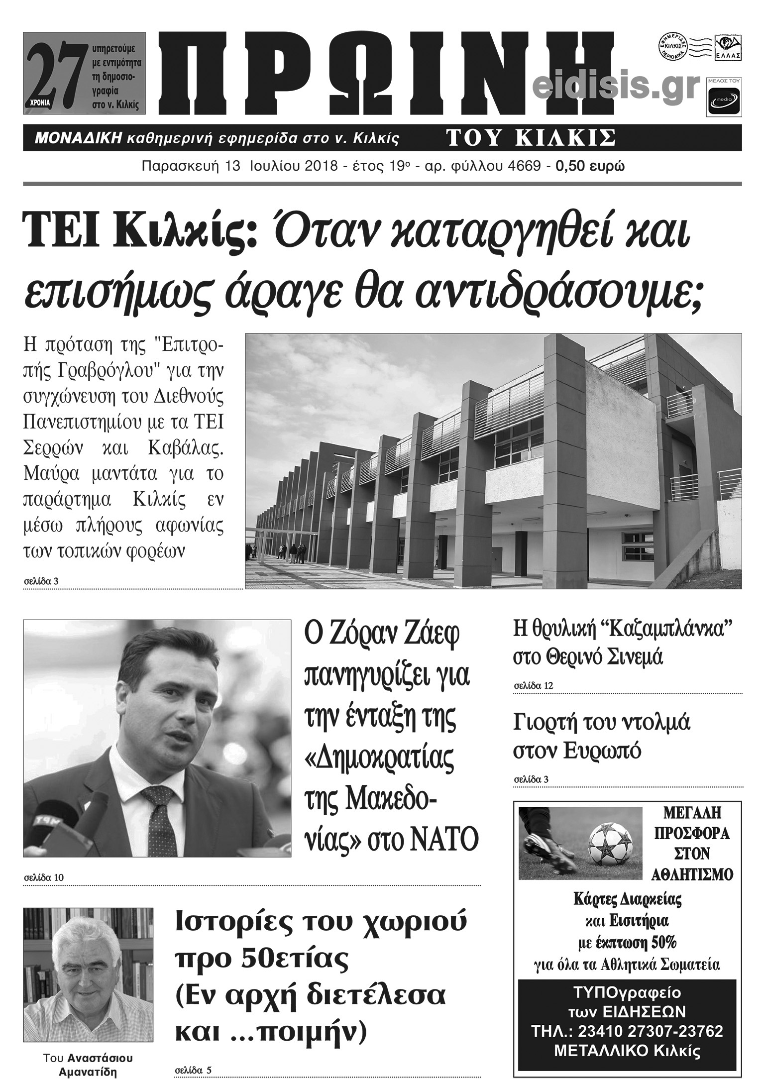 Πέντε χρόνια πριν. Διαβάστε τι έγραφε η καθημερινή εφημερίδα ΠΡΩΙΝΗ του Κιλκίς (13-7-2018)