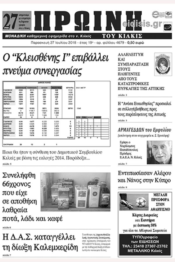 Πέντε χρόνια πριν. Διαβάστε τι έγραφε η καθημερινή εφημερίδα ΠΡΩΙΝΗ του Κιλκίς (27-7-2018)