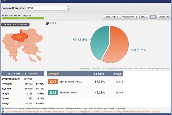 Για πρώτη φορά η λαϊκή βούληση, όπως εκφράστηκε σε δημοψήφισμα, υπερέβη με ηχηρό τρόπο τις κομματικές επιλογές και διαμόρφωσε ένα άλλο πολιτικό τοπίο στην χώρα, αλλά και στο νομό. Με ποσοστό 57,74% οι Κιλκισιώτες υπερψήφισαν την Κυριακή 5 Ιουλίου το ΟΧΙ στην πρόταση των δανειστών και κατ’ ουσίαν αξιώνοντας καλύτερη – βιωσιμότερη συμφωνία μαζί τους.