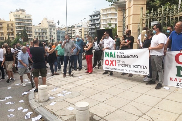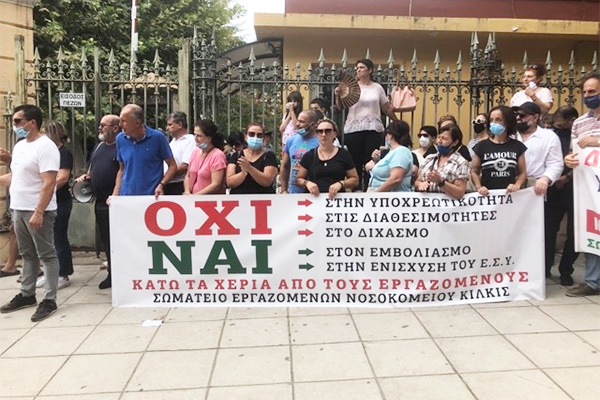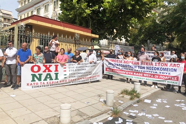 Στη συγκέντρωση συμμετείχαν και εργαζόμενοι του νοσοκομείου Κιλκίς με τα δυο πανό τους και κεντρικό σύνθημα: «Ναι στον Εμβολιασμό, Όχι στην Υποχρεωτικότητα, Όχι στον καταναγκασμό», καθώς και εργαζόμενοι του νοσοκομείου Γουμένισσας με δικό τους πανό.
