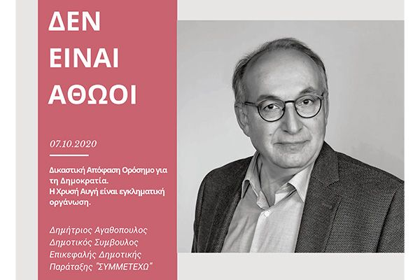 Η Χρυσή Αυγη δεν είναι πολιτικό κόμμα, είναι η εγκληματική οργάνωση που οργανωσε και εκτέλεσε δολοφονίες και ξυλοδαρμούς, που έσπειρε το μίσος και τη διχόνοια, που γέμισε με φόβο την κοινωνία μας που στήριξε τη δυναμη της στο ρατσισμό, την ξενοφοβία και τον φασισμό. Η κοινωνία μίλησε και η δικαιοσυνη αποφάσισε. Οι ναζί θα πανε εκεί που ανήκουν, στη φυλακη και στις μαύρες σελίδες της ιστορίας. Η Ελλάδα χτες αποτέλεσαι παράδειγμα για όλη την Ευρωπη. Η μεγάλη πλειοψηφία του λαού έδειξε πως η αρρώστια του Ναζισμού δεν έχει χώρο στην κοινωνία μας και οι ομοϊδεάτες της εγκληματικής οργάνωσης δεν έχουν χώρο ανάμεσα μας.
