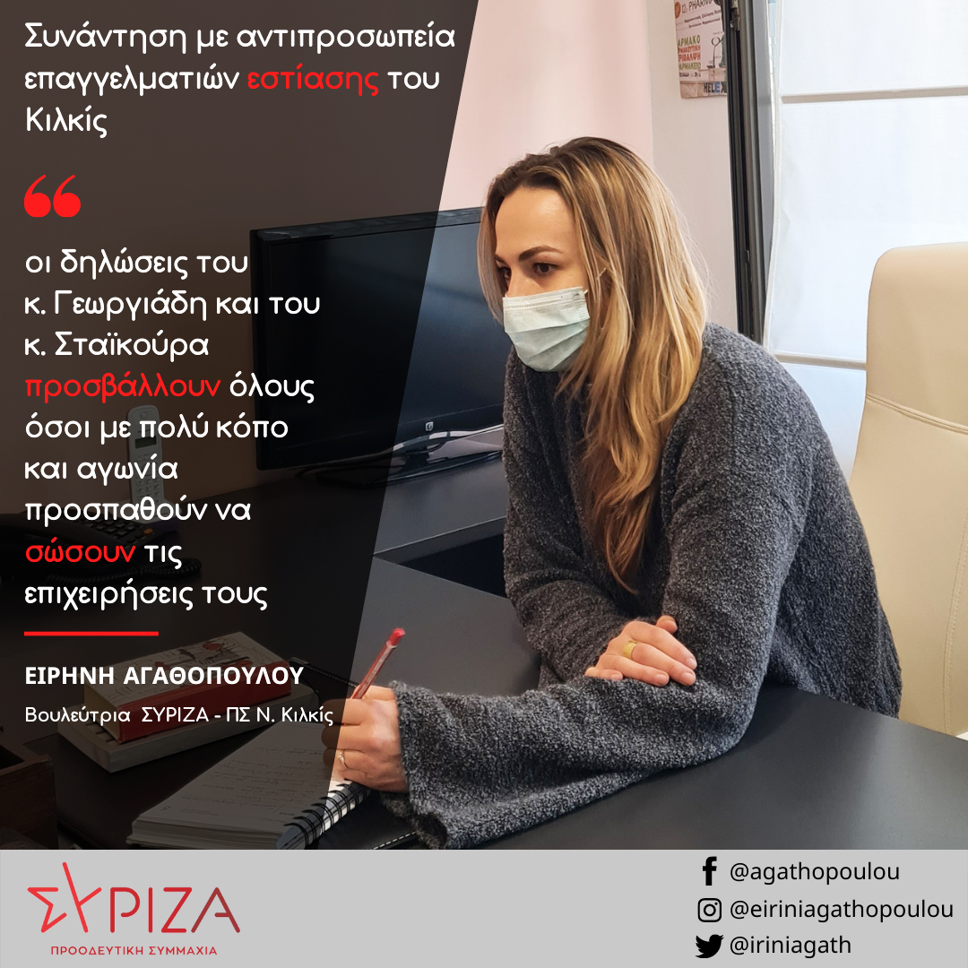 Η Ειρήνη Αγαθοπούλου αναφέρθηκε στις προτάσεις του ΣΥΡΙΖΑ – ΠΣ για τη στήριξη των μικρομεσαίων επιχειρήσεων, την στήριξη της τοπικής οικονομίας αλλά και για την διαχείριση της συσσώρευσης των εκκρεμών υποχρεώσεων των επιχειρηματιών, λέγοντας «ο ΣΥΡΙΖΑ – ΠΣ από την πρώτη στιγμή ζήτησε γενναιόδωρη στήριξη των επιχειρήσεων και της οικονομίας εμπροσθοβαρώς, καθώς και αξιοποίηση όλων των ευρωπαϊκών εργαλείων χρηματοδότησης προς όφελος των μικρομεσαίων επιχειρήσεων. Βέβαια, για να μπορέσουν να “επιβιώσουν” οι επιχειρήσεις πρέπει να διαγραφεί ένα μέρος των οφειλών που δημιουργήθηκαν μέσα στην πανδημία, να μετατραπεί το σύνολο της επιστρεπτέας προκαταβολής σε μη επιστρεπτέα και οι υπόλοιπες οφειλές προς το δημόσιο και τα ασφαλιστικά ταμεία να ρυθμιστούν σε βάθος χρόνου». Επίσης, ανέφερε ότι «οι δηλώσεις του κ. Γεωργιάδη και του κ. Σταϊκούρα προσβάλλουν όλους όσοι με πολύ κόπο και αγωνία προσπαθούν να σώσουν τις επιχειρήσεις τους».