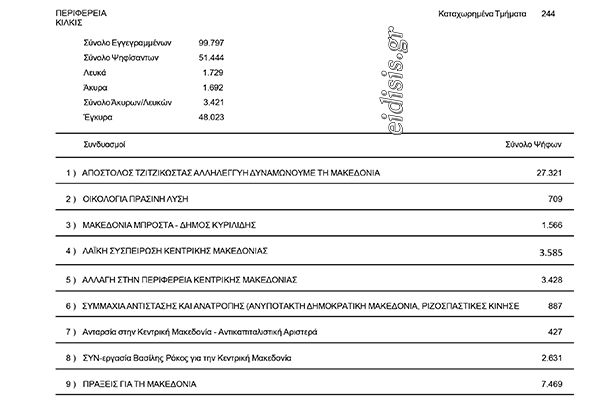 Τα επίσημα αποτελέσματα των εκλογών στην Περιφέρεια Κ. Μακεδονίας για το ν. Κιλκίς