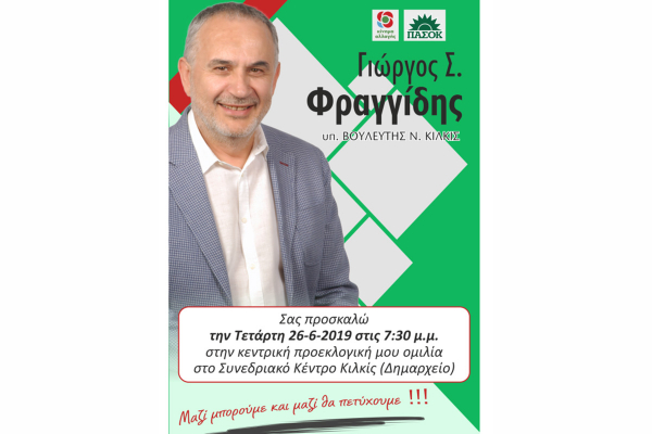 Την ερχόμενη Τετάρτη 26 Ιουνίου θα πραγματοποιηθεί η μεγάλη συγκέντρωση του υποψήφιου βουλευτή του Κινήματος Αλλαγής, Γιώργου Φραγγίδη. Η κεντρική προεκλογική του ομιλία θα γίνει στο Συνεδριακό Κέντρου του Κιλκίς (Δημαρχείο), στις 7:30 το απόγευμα.